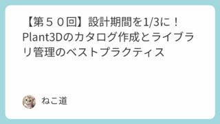 Plant3D 【第50回】設計期間を1/3に!Plant3Dのカタログ作成とライブラリ管理のベストプラクティス プラント設計において、すべてが標準部品で済むことは稀です。特殊なバルブ、カスタム仕様の計装品など、プロジェクト固有のカスタムパーツをいかに迅速かつ正確に作成できるかが、設計期間に直結します。しかし、カスタムパーツの作成が煩雑だと、設計期間が... 2025.10.08 Plant3D