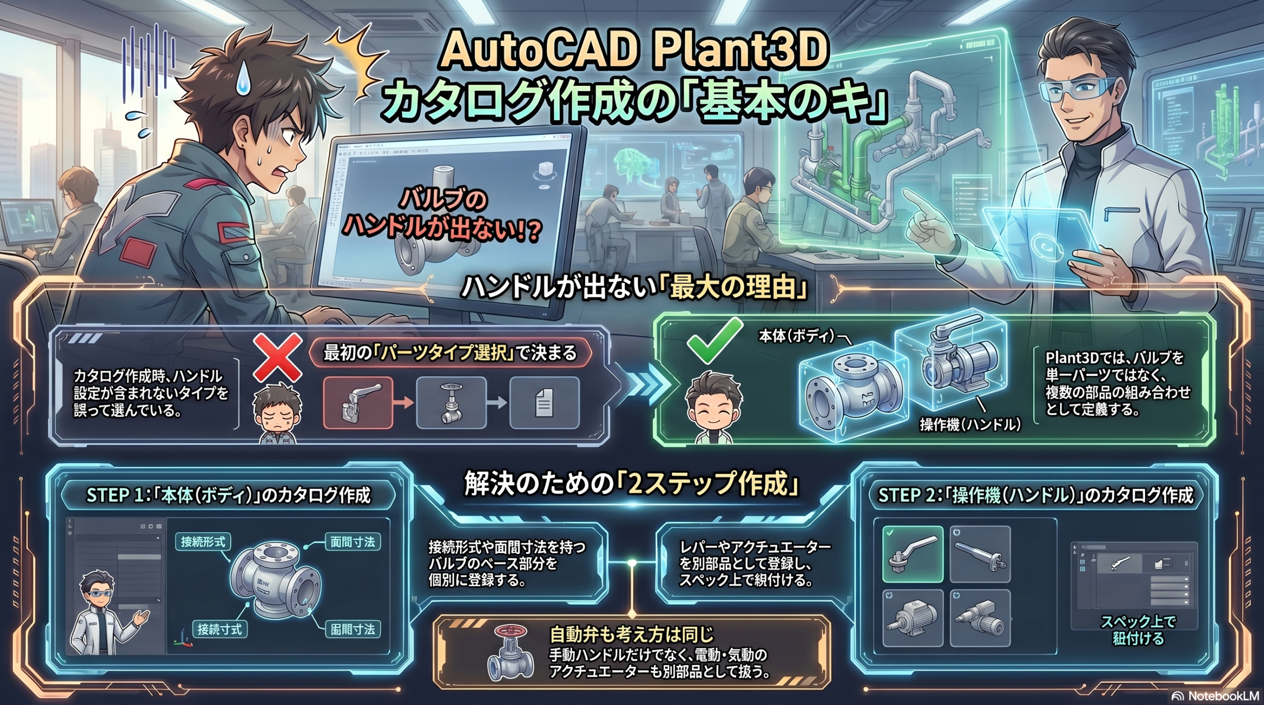 今回はカタログ作成のやってしまいがちな失敗談についてお話ししていきたいと思います。Plant3Dのカタログ作成で 「よし、新しいバルブを登録するぞ!」と意気込んでパーツを作成したものの、いざスペックに落とし込んで配置してみると……。