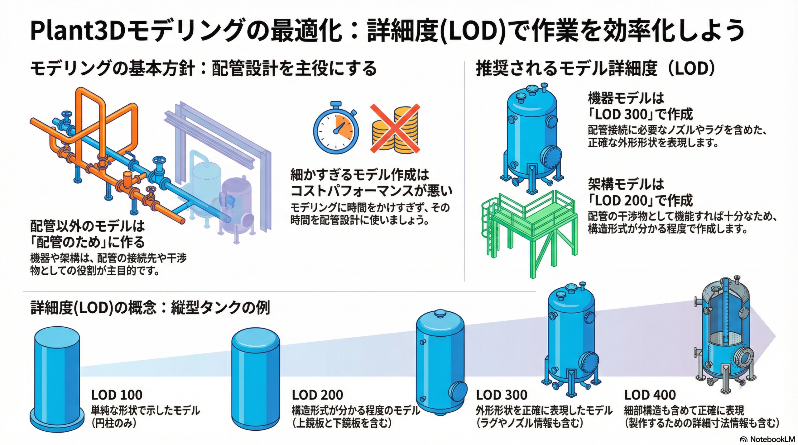 上表の「(例)縦型タンク」が、私なりのプラント配管設計における機器モデルの考え方です。私はいつも機器モデルをLOD300で作成します。LOD400を目指すとモデリングに時間がかかりすぎてしまうためです。そんな時間があったら配管の設計に充てたいと思っています。