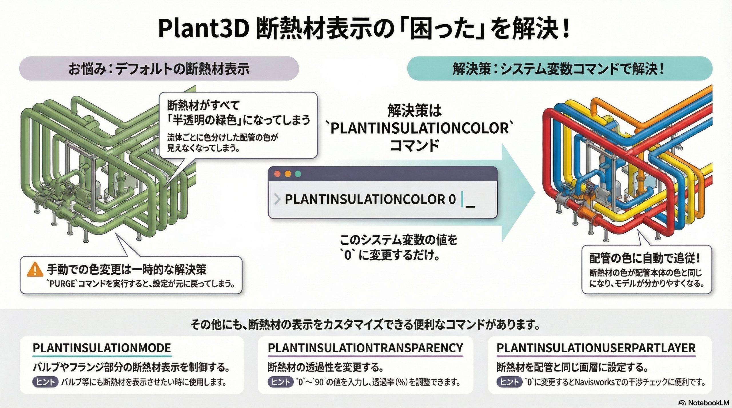 PLANTINSULATIONCOLORというシステム変数設定コマンドを実行して、値を0にします。すると、以前のように配管の色に合わせて自動で断熱材の色が変わります!!
