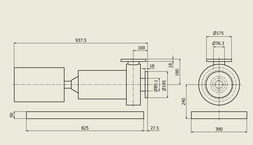 こちらがInventor上で3Dと自動連係する2D図面になります。各寸法は、3Dモデルパラメータから引用しているので、寸法値も自動的に変わります。