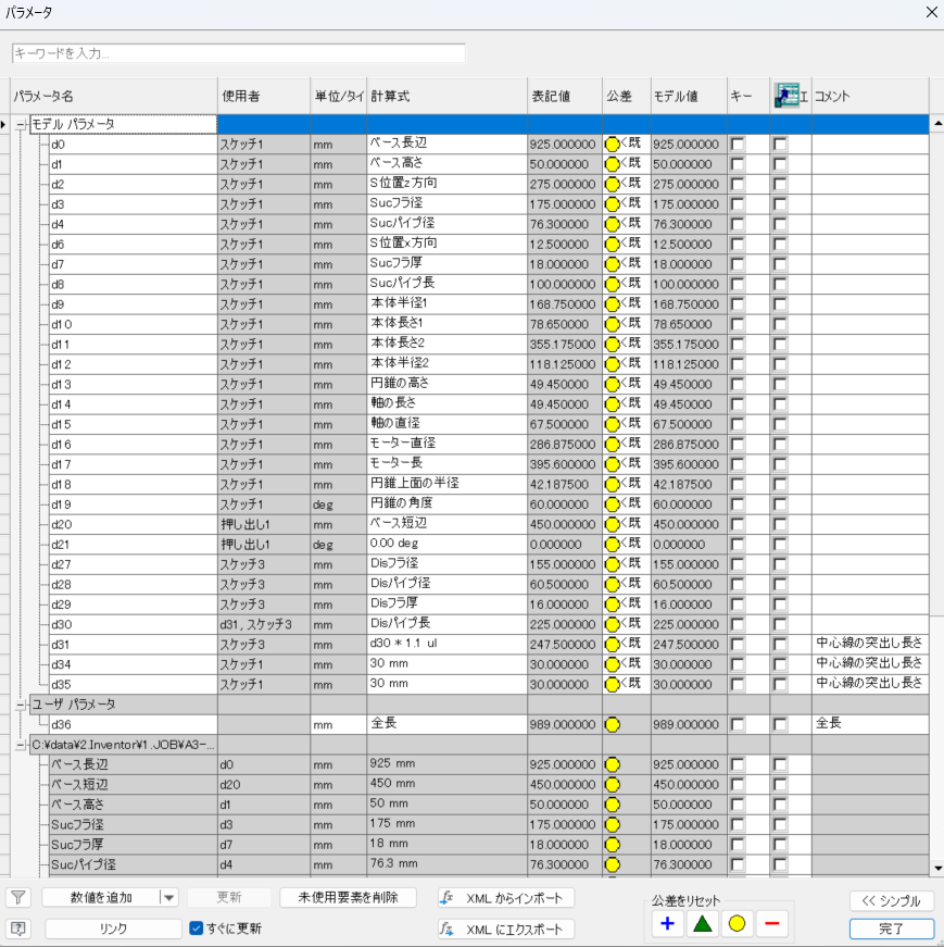 こちらが3Dモデルで使われているパラメータです。下の方に出ているカスタムパラメータがエクセルから自動的に入ってくるパラメータです。グレーアウトしていて、Inventor上では編集できないようになっていますね。