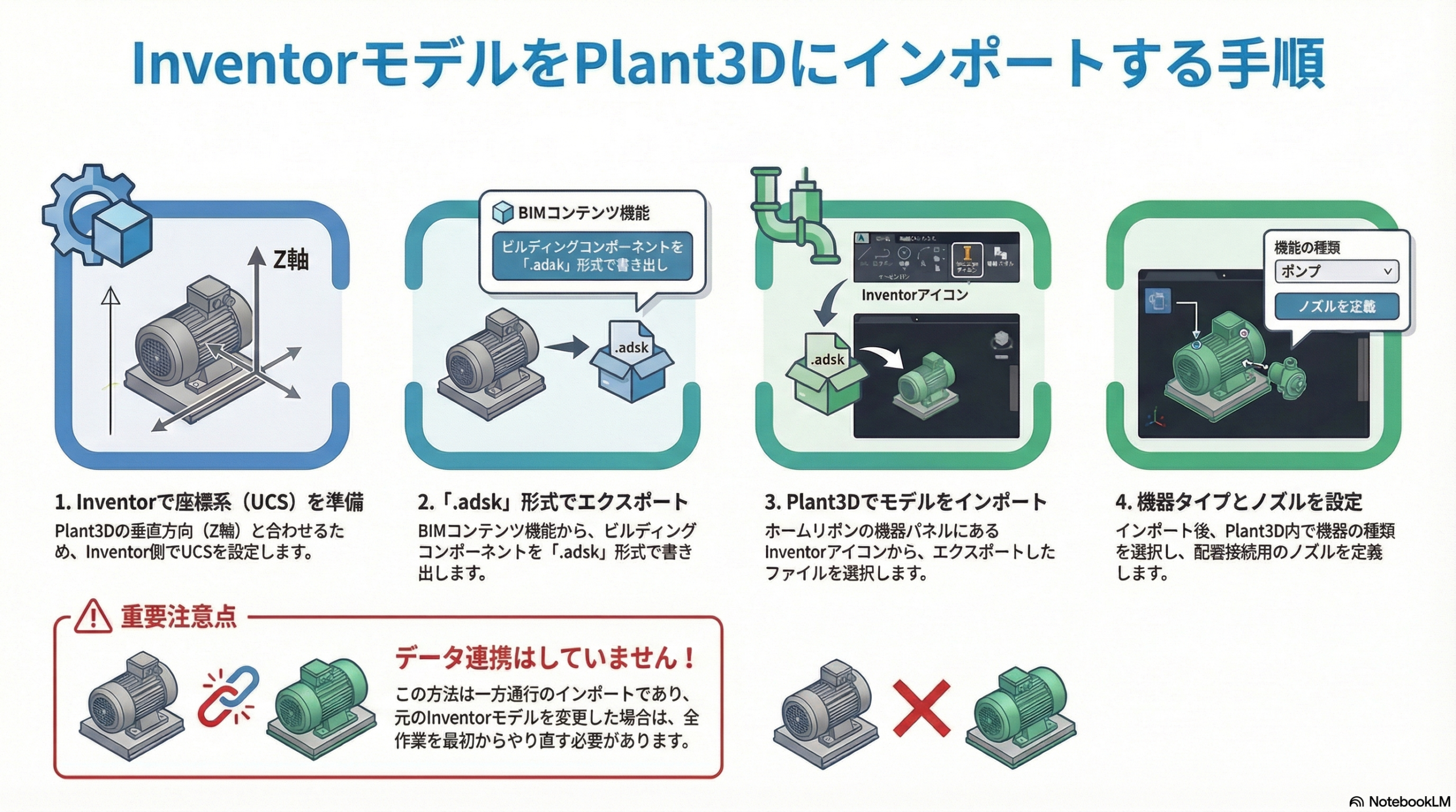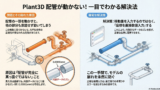 ただし、問題点もあります。Inventorからエクスポート→Plant3Dへインポートという作業になりますのでデータ連携はしていません。つまり、機器モデルが変更になったら、上記の作業を全て1からやり直すことになります。特にノズルの設定などは、数が多い場合はとても手間です。もう少しシームレスな連携になるようにソフトがアップデートされる事を期待しています。