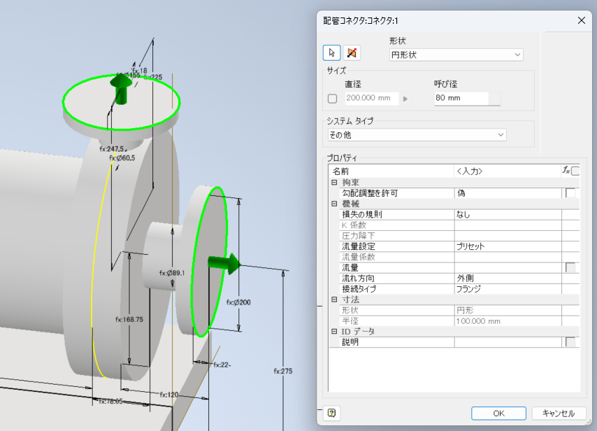下図では呼び径に「80」と入力、プロパティの接続タイプに「フランジ」と入力しました。緑色で表示されている対象の面と配管の繋がる向きを示す矢印が作成されます。