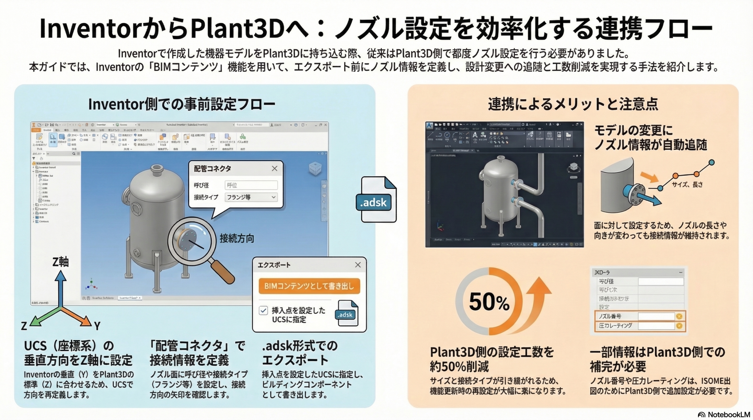 今回は、【第18回】Inventorで作成したモデルをPlant3Dへインポートする方法で記載していた内容のアップデートになります。ノズル設定はInventor側でできないため、機器が更新されるたびに、毎回ノズル設定をAutoCAD Plant3D(以下Plant3D)側で設定しなければならないため、大変手間がかかるとお伝えしたのですが、コメントをいただいた方から有益な情報をいただきました。その詳細についてお話ししていきます。