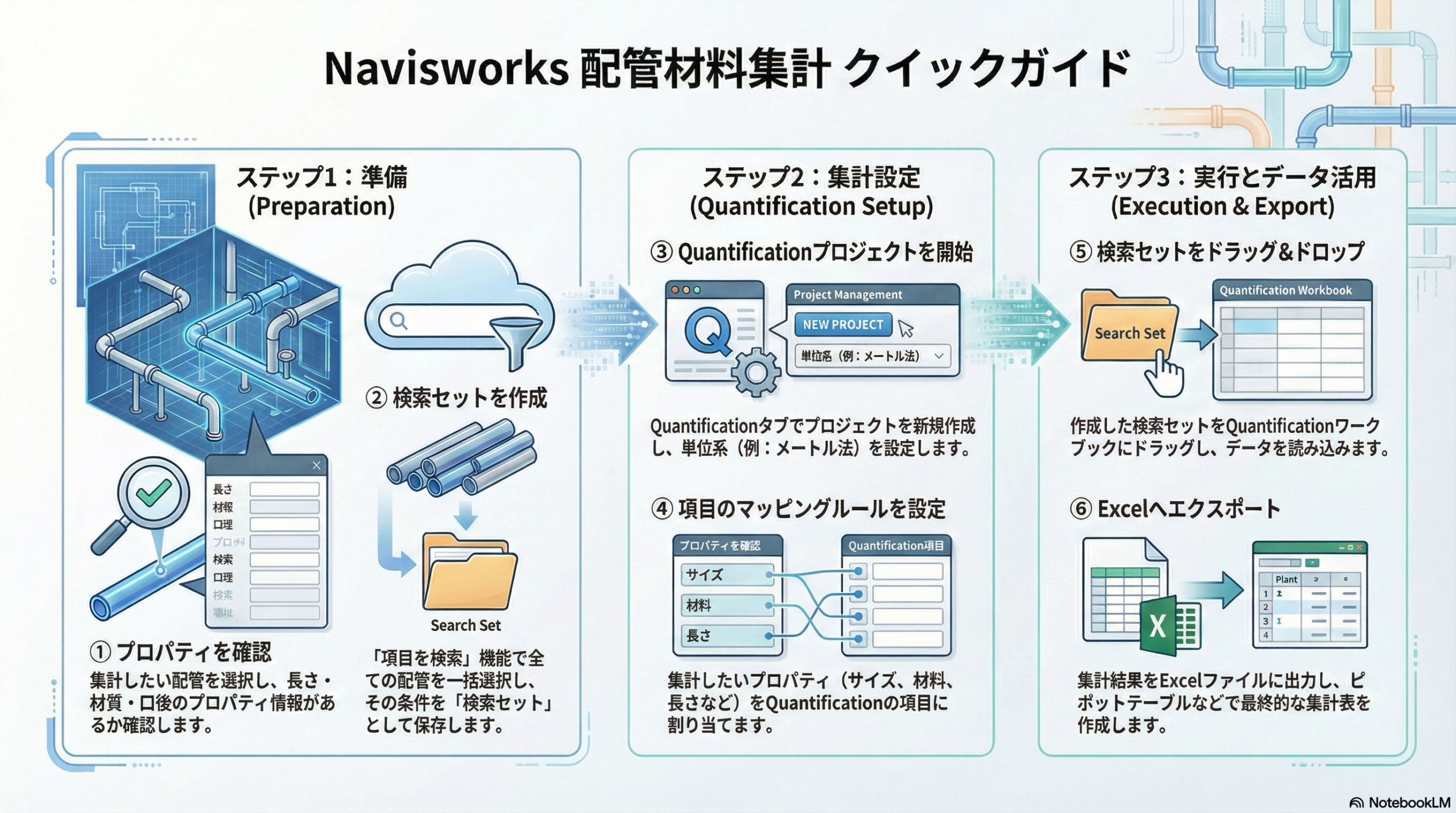 先ほど作成した検索セットを利用して、集計したい配管を全選択します。その状態で、下にあるタブ「Quantificationワークブック」を選択して、新規項目にドラック&ドロップで挿入します。