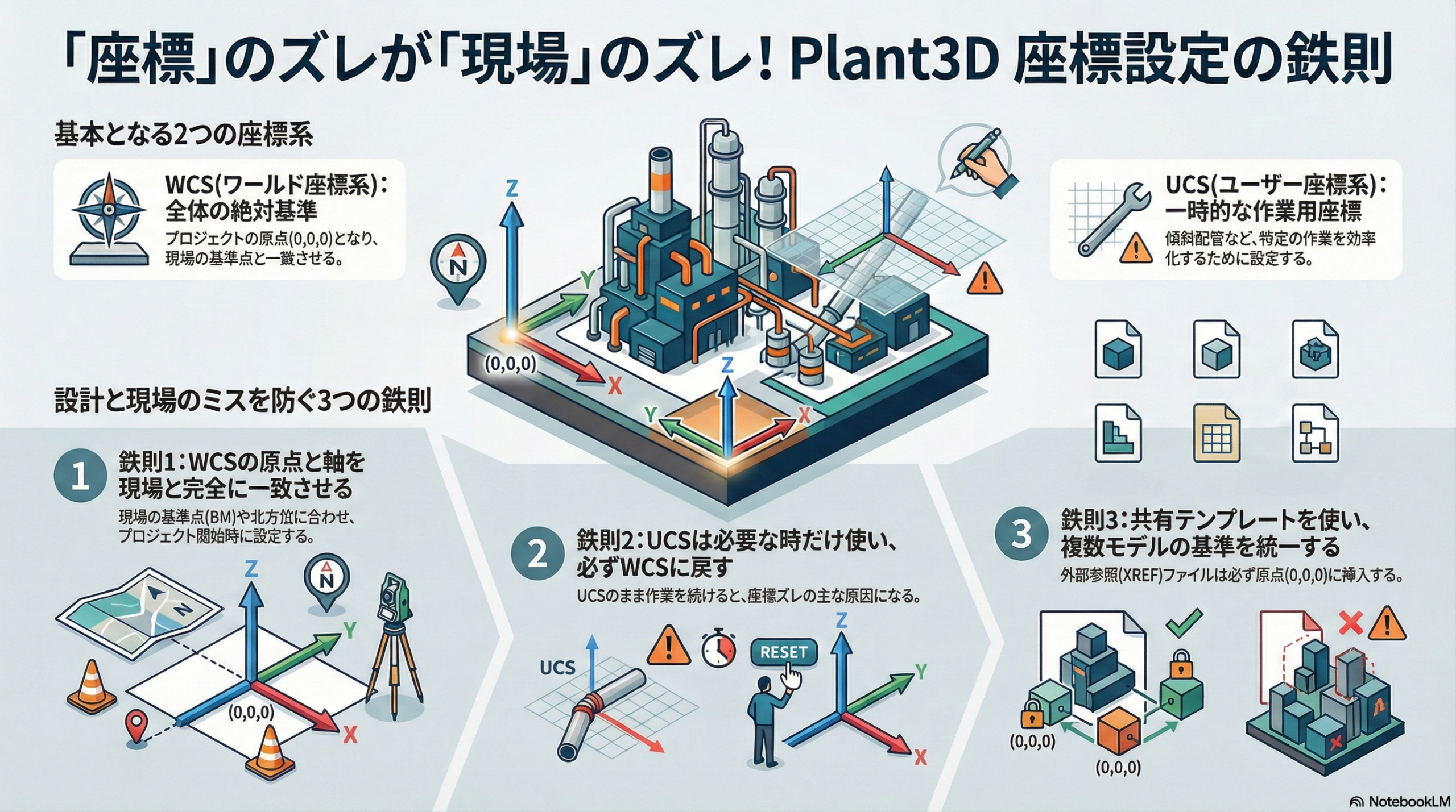 Plant3Dにおける座標(X, Y, Z)は、単なる位置情報ではなく、設計、施工、現場管理のすべての関係者が参照する「共通の言語」です。この言語を誤解すると、数mmのズレが数mの手戻りに繋がります。