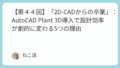 最初の障壁は高いかもしれませんが、このロードマップ通りに進めれば、あなたの設計効率は必ず向上します。さあ、Plant3Dで設計の未来を掴みましょう!