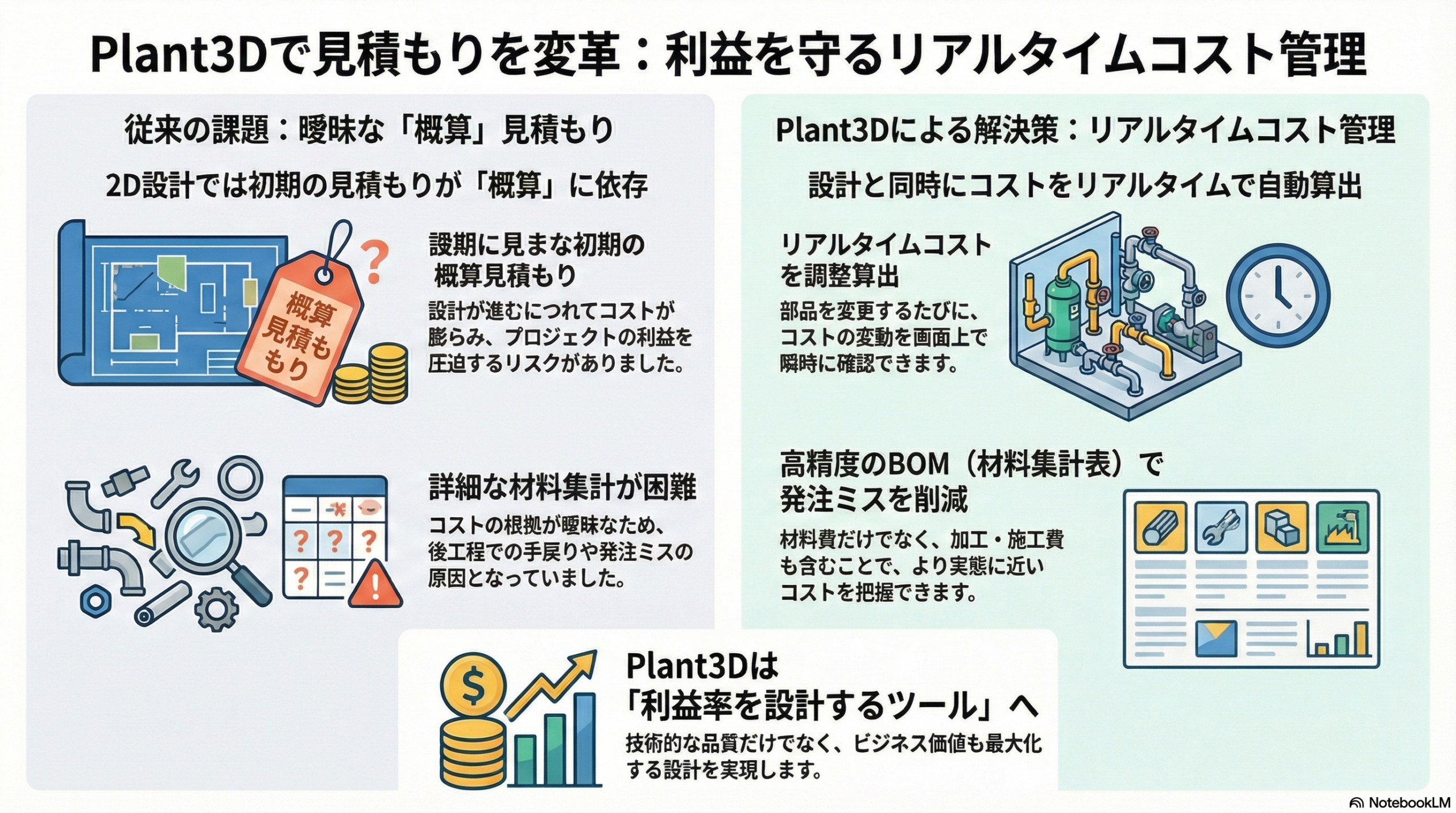 Plant3Dは、単なる配管設計の効率化だけでなく、プロジェクトの利益率を設計するツールとなります。リアルタイムコスト管理の仕組みを構築することで、あなたは技術的な品質だけでなく、ビジネス的な価値も最大化できる設計者になれるでしょう。