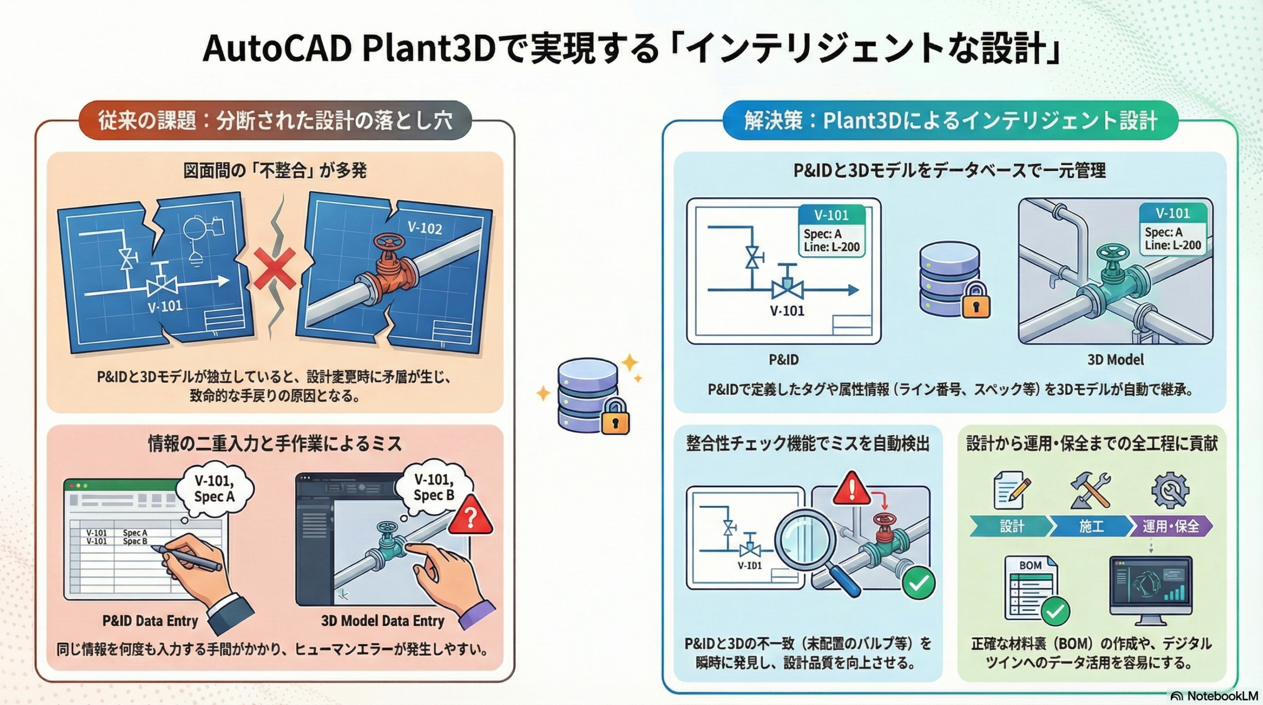 プラント設計において、P&ID(配管計装図)は設計の思想であり、3Dモデルは設計の具現化です。しかし、この二つが独立して作成・管理されていると、設計変更の際に図面間の不整合が発生し、それが致命的な手戻りやミスの原因となります。