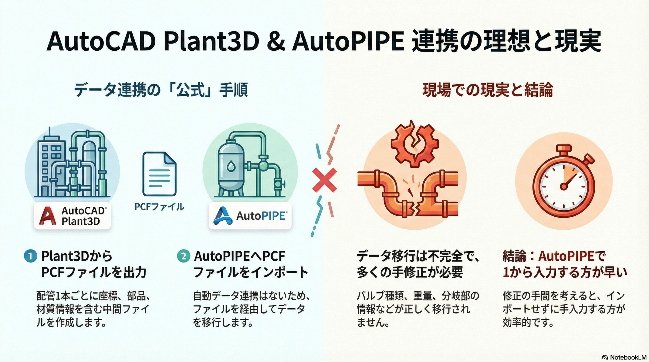 • Plant3DとAutoPIPEは、pcfファイルを経由することでデータを移すことができる。