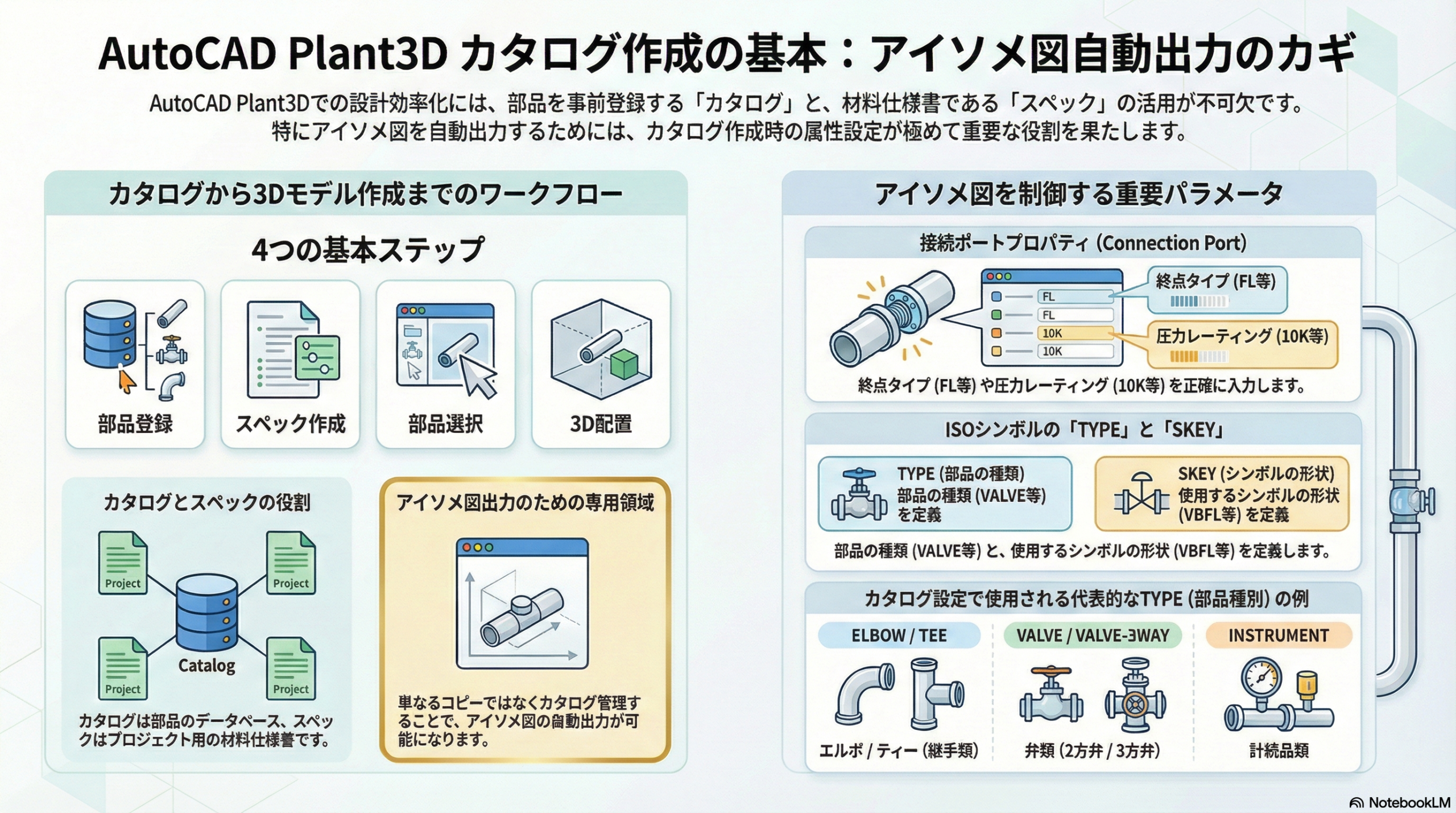今まで3Dモデル関係の話をたくさんしてきましたが、いよいよカタログ作成関係についてお話ししていきたいと思います。AutoCAD Plant3D(以下Plant3D)で、3Dモデル入力が一通りできるようになったら次に学ぶポイントがカタログとスペックになります。