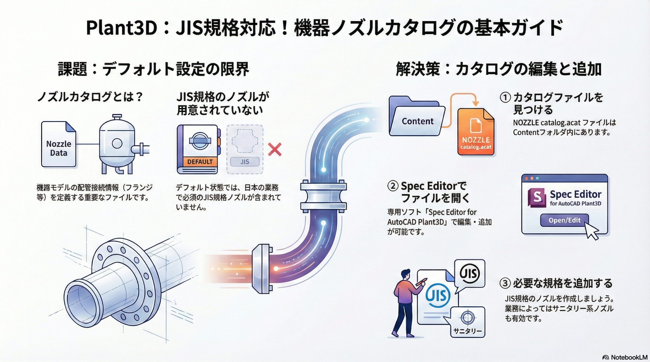 ノズルカタログは、デフォルト設定では配管カタログと同じ場所にいます。パスとしては、C:\AutoCAD Plant 3D 2025 Content(2025の部分はバージョンになります)になります。その中のCPak Common内にあるNOZZLE catalog.acatファイルになります。このファイルをSpec Editor for AutoCAD Plant3Dというソフトで開くことで内容を修正、あるいは追加することができます。ソフトの開き方などは【第31回】で詳しく説明しているのでそちらもご覧ください。