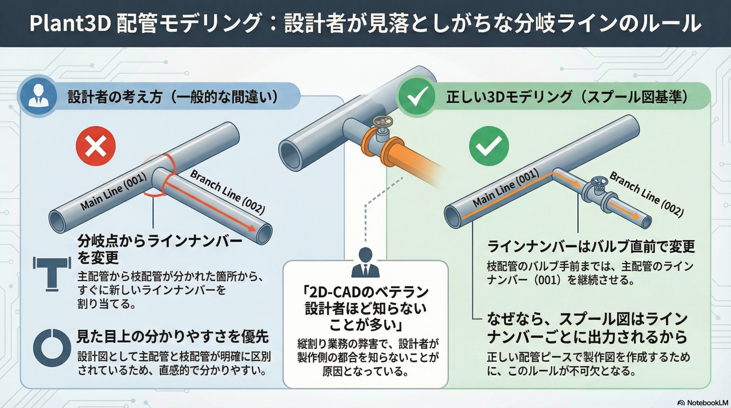 言われてみれば当たり前なんですが、この業界では役割分担が縦割りになっていることが多く、配管設計者は工事業者さんがどのように考えているかを知らないことが結構あります。2D-CADで作図する配管図の場合は、ここまで深く考えなくても図面として成立してしまうため、3D-CADを使用しないベテランの配管設計者はそもそもこの事を知らないことが多いです。