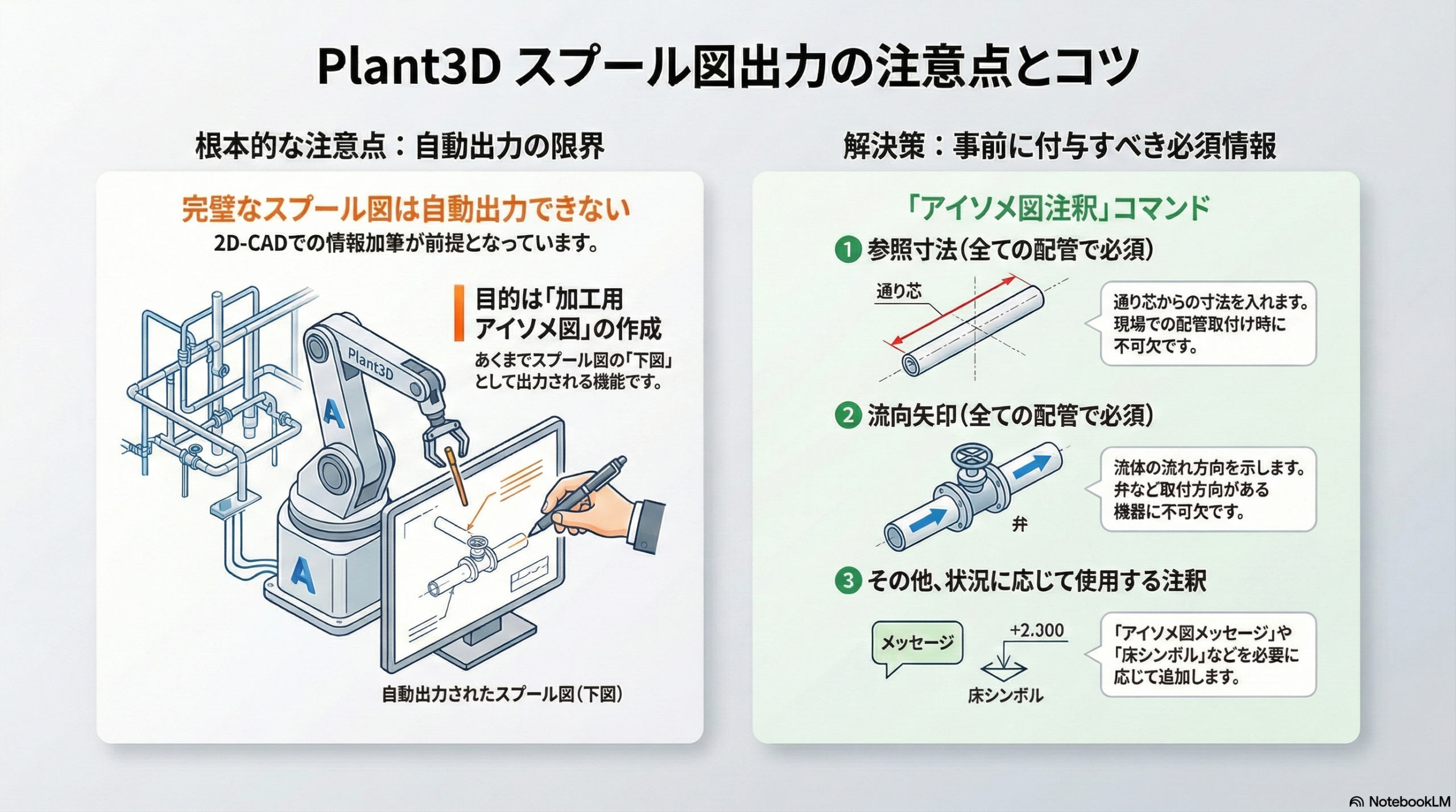 これらの情報を配管に付与させてから、スプール図を出力して、さらに必要な情報を2D-CADにて加筆することでスプール図が完成します。