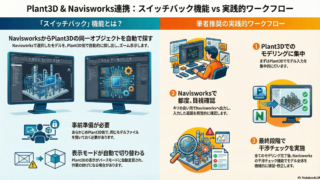 Navisworks 【第79回】AutoCAD Plant3DとNavisworksのスイッチバック連携について 今回はAutoCAD Plant3D(以下Plant3D)とNavisworksの連携方法であるスイッチバック機能についてお話ししたいと思います。ネタ元はコメントをくださった方からの一言です。詳細を色々調べてみましたので正直な感想をお伝えし... 2026.01.26 NavisworksPlant3D