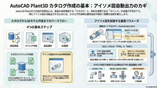 Plant3D 【第82回】AutoCAD Plant3D カタログ作成時のSKEYとTYPEについて その1 今まで3Dモデル関係の話をたくさんしてきましたが、いよいよカタログ作成関係についてお話ししていきたいと思います。AutoCAD Plant3D(以下Plant3D)で、3Dモデル入力が一通りできるようになったら次に学ぶポイントがカタログとス... 2026.02.13 Plant3D